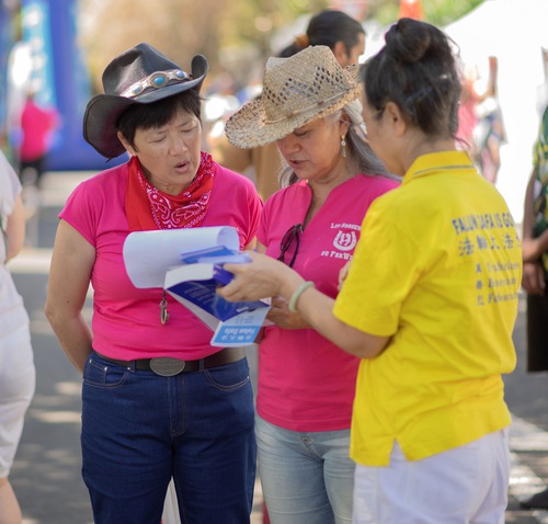 Practitioners also demonstrated the exercises on stage several times. They introduced the practice and talked about the benefits of practicing the exercises and following the principles of Truthfulness, Compassion, and Forbearance. Many people were happy to learn that Falun Dafa is taught for free and were interested in trying the exercises.