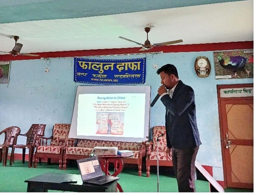 After a woman learned in detail about Falun Dafa and how it is persecuted under the Chinese communist regime, she took a small lotus flower and a flyer, and wished the practitioners success.