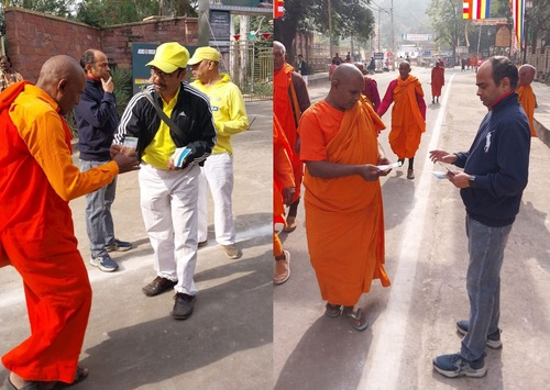 (Minghui.org) Falun Dafa practitioners participated in the 71st Mahabodhi Festival in Sanchi, India, on November 25 – 26, 2023. They distributed nearly 25,000 informational fliers, and held an introductory session where they demonstrated the Falun Dafa exercises at a government school. Their booth attracted many people, including travelers from around the world.