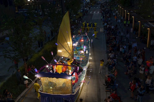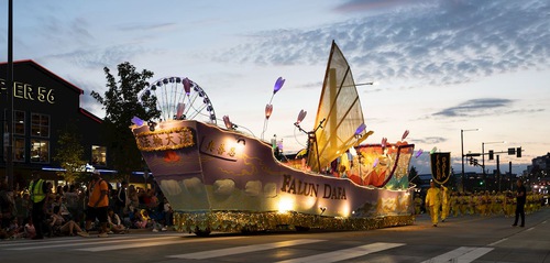 Practitioners participated in the Capital Lakefair Grand Parade in Olympia, Washington a week prior. The parade was held during the day so the practitioners used a different setup for the float. The person in charge of the Lakefair Parade was in the Torchlight Parade that day. She told practitioners that she loved both setups because they looked gorgeous. She invited practitioners back to the Lakefair Parade next year.