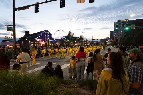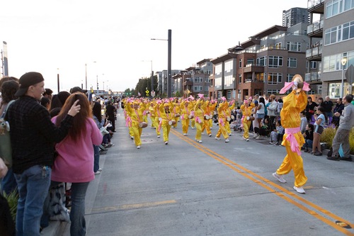 (Minghui.org) The annual Seafair Torchlight Parade was held in Seattle on the evening of July 26, 2025. Thousands of people lined the streets to watch it in person, while thousands more watched it live on television or on the Internet. Falun Dafa practitioners from Seattle and Vancouver rode on the float they made, played the waist drums and carried banners during the parade.