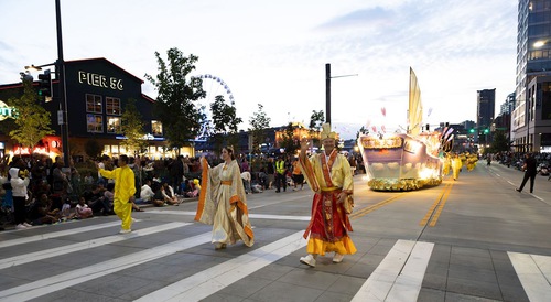 The Seafair Torchlight Parade is an eagerly anticipated annual event that celebrates summer in Seattle. It was first held in 1950 and has become a fixture in the American Northwest. Falun Dafa practitioners first joined the parade 20 years ago in 2005, and they’ve become an integral part of this important cultural tradition. The theme of this year’s Falun Dafa entry was: Udumbara Flowers Reappear in the World.