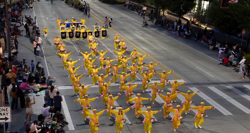 The Waist Drum Team, made up of dozens of practitioners, walked behind the float. In their bright yellow uniforms, they played the waist drums, a traditional Chinese musical instrument that’s been around for thousands of years. The team performed pieces such as “Falun Dafa Is Good” and “Festive Celebration.” The music conveyed to the audience the messages of Truthfulness, Compassion, and Forbearance, which are the principles practitioners live by.