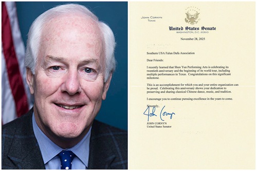 (Minghui.org) U.S. Senator John Cornyn from Texas, wrote to the Southern USA Falun Dafa Association on November 28, 2025, to congratulate the artists on the 20th anniversary of the founding of Shen Yun Performing Arts. He also thanked the artists for their dedication and excellence.