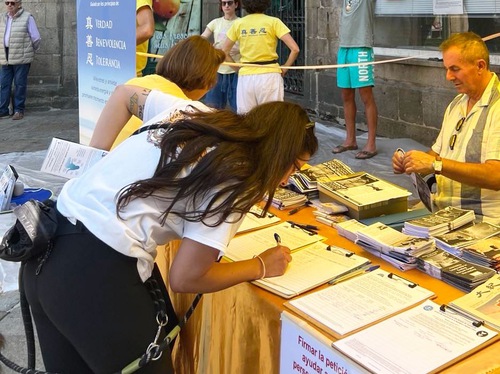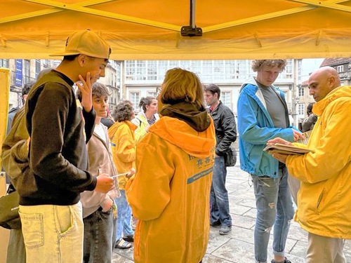 They set up a booth at Praza do Toural in the city centre, talked about Falun Dafa, and collected signatures on a petition that calls to end the persecution. The square is surrounded by 18th and 19th-century buildings and connects the city’s older and newer areas. It’s a popular gathering spot for locals, tourists, and pilgrims who walk the Camino de Santiago (Way of St. James).