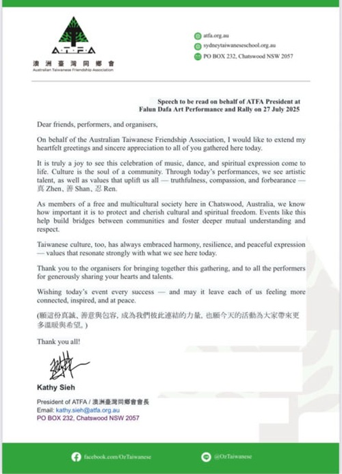 Kathy Sieh, President of the Australian Taiwanese Friendship Association, wrote in her letter: “On behalf of the Australian Taiwanese Friendship Association, I would like to extend my heartfelt greetings and sincere appreciation to all of you gathered here today.