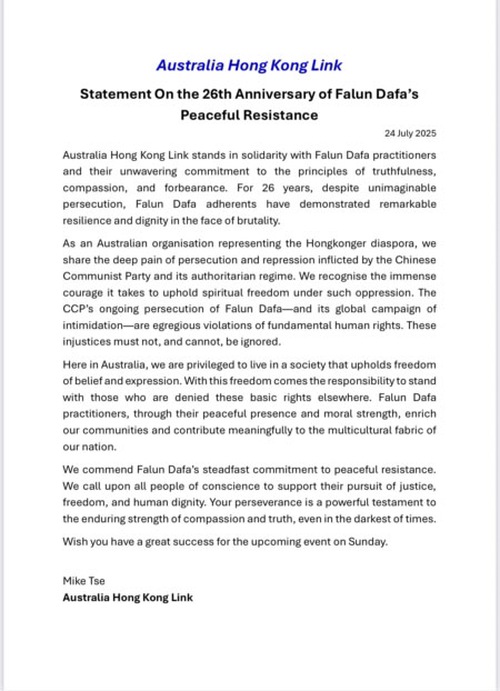 In the letter received from Australia Hong Kong Link: “Australia Hong Kong Link stands in solidarity with Falun Dafa practitioners and their unwavering commitment to the principles of Truthfulness, Compassion, and Forbearance. For 26 years, despite unimaginable persecution, Falun Dafa adherents have demonstrated remarkable resilience and dignity in the face of brutality.