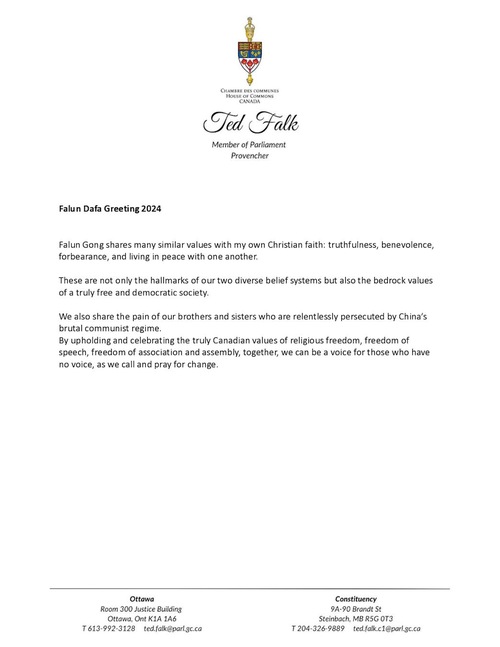 OtherMay 8, 2024Canadian Elected Officials Send Congratulations for the 32nd Anniversary of Falun Dafa’s Introduction