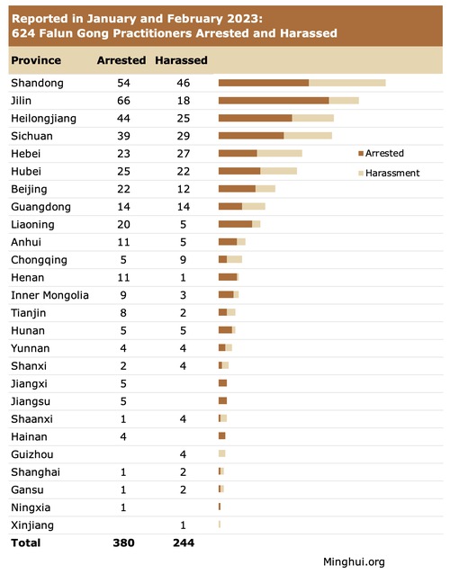 China NewsMarch 19, 2023Reported in January and February 2023: 624 Falun Gong Practitioners Arrested or Harassed for Their Faith