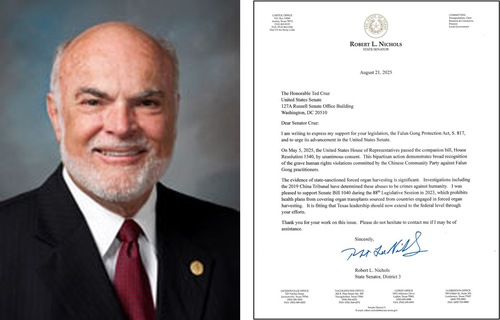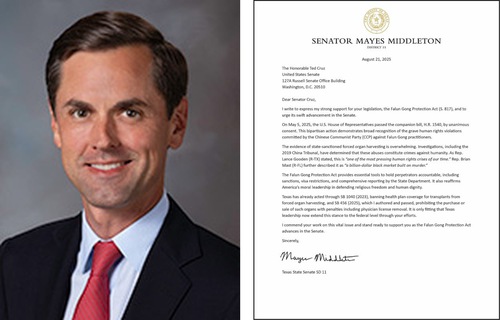 Mayes Middleton, a Republican state senator from the 11th District and vice chair of the Texas Senate Higher Education Subcommittee, wrote, “The evidence of state-sanctioned forced organ harvesting is overwhelming. Investigations, including the 2019 China Tribunal, have determined that these abuses constitute crimes against humanity. As Rep. Lance Gooden (R-TX) stated, this is ‘one of the most pressing human rights crises of our time.’ Rep. Brian Mast (R-FL) further described it as ‘a billion-dollar black market built on murder.’”