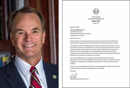 Steve Toth, senior congressman from the Texas House of Representatives’ 15th District, wrote, “The persecution of Falun Gong practitioners by the Chinese Communist Party is a well-documented violation of international norms and basic human rights. Reports of forced organ harvesting, arbitrary detention, and other abuses demand a clear and decisive response from the United States.