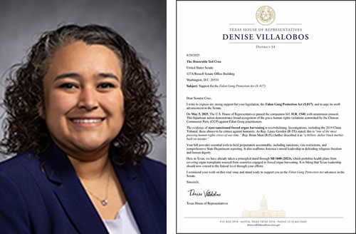 Representative Denise Villalobos from the Texas 34th District wrote to Senator Cruz, “I commend your work on this vital issue and stand ready to support you as the Falun Gong Protection Act advances in the Senate.”