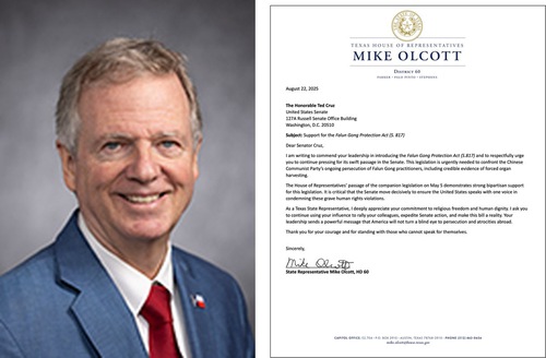 “This legislation is urgently needed to confront the Chinese Communist Party’s ongoing persecution of Falun Gong practitioners, including credible evidence of forced organ harvesting,” wrote Representative Mike Olcott.