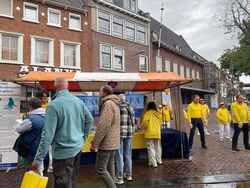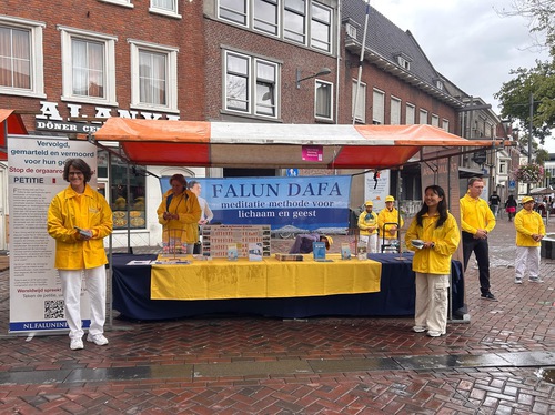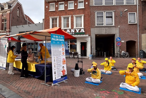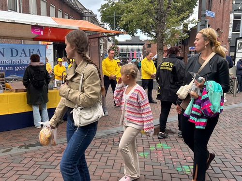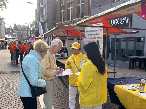 They set up a booth at Bloemenmarkt (the flower market), demonstrated the Falun Dafa exercises, distributed flyers, and told people how the Chinese Communist Party (CCP) persecutes the practice. They also sought signatures on a petition to end the persecution. Many people were drawn to the booth. Some watched quietly, while others joined practitioners and did the exercises. Many people signed the petition.