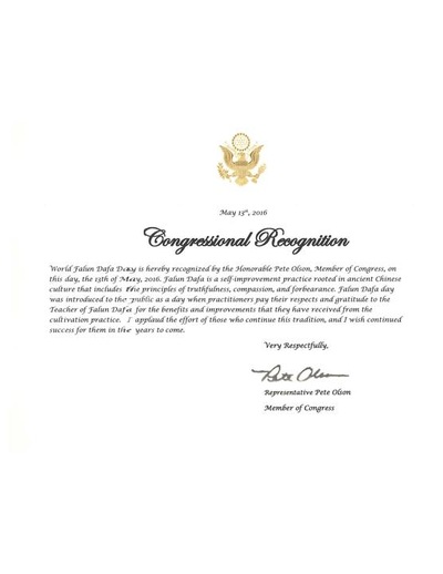 May 07, 2016 | Five U.S. representatives in Texas issued proclamations and expressed support for celebrations in Texas of the 17th World Falun Dafa Day on May 13, 2016. Their congratulatory letters were sent to the Southern USA Falun Dafa Association.