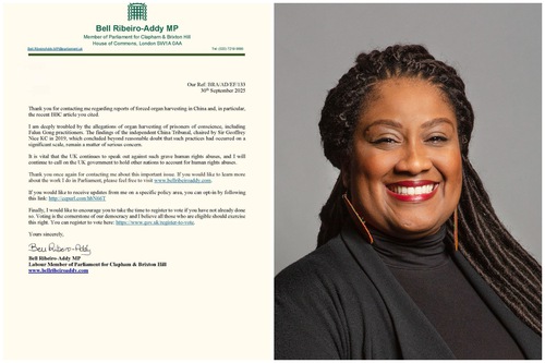 Bell Ribeiro-Addy MP stated in her letter, “I am deeply troubled by the allegations of organ harvesting of prisoners of conscience, including Falun Gong practitioners. The findings of the independent China Tribunal, chaired by Sir Geoffrey Nice KC in 2019, which concluded beyond reasonable doubt that such practices had occurred on a significant scale, remain a matter of serious concern.”