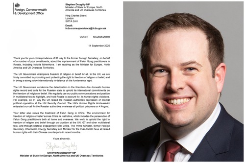 Regrading the CCP’s persecution of Falun Dafa (also known as Falun Gong), he stated, “The environment for freedom of religion or belief across China is restrictive, which includes the persecution of Falun Gong practitioners both at home and overseas. We work to uphold the right to freedom of religion and belief through our position at the UN, G7 and other multilateral fora, and through bilateral engagement with China. The Prime Minister, former Foreign Secretary, Chancellor, Energy Secretary and Minister for the Indo-Pacific have all raised human rights with their Chinese counterparts in recent months.”