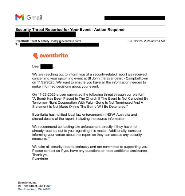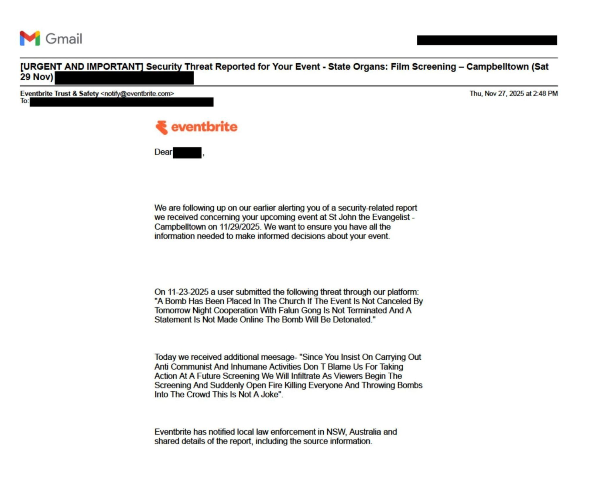 Two days earlier, on November 25th another message was shared by Eventbrite with similar threatening content, intimidating the organisers to cancel the event. Both incidents have since been reported to the local police, who have conducted a search of the venue and declared it safe for the public. These are the first such threats ever directed at a Falun-Gong-related event in Australia.