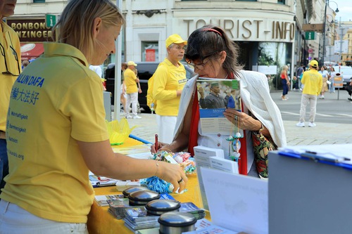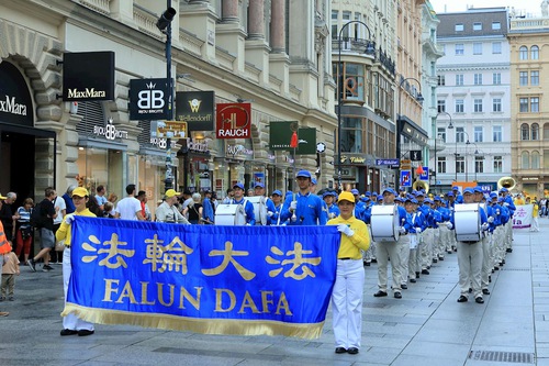 Practitioners also held a parade in the centre city of Vienna. The Tian Guo Marching Band led the parade and practitioners demonstrated the Falun Dafa exercises and carried banners which had information about Falun Dafa. The goal was to tell people about Falun Dafa and raise public awareness of the ongoing persecution in China.