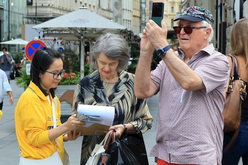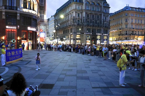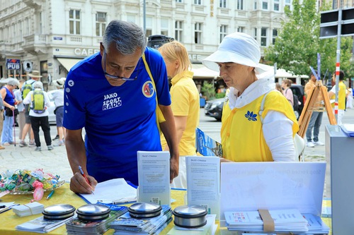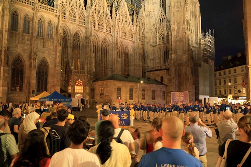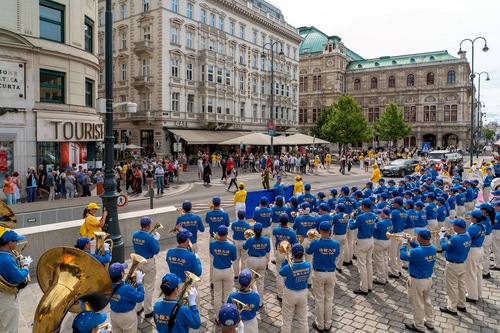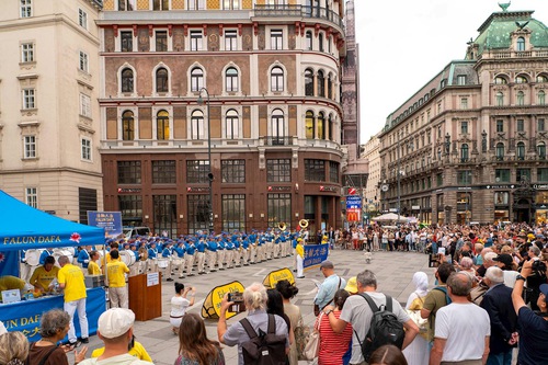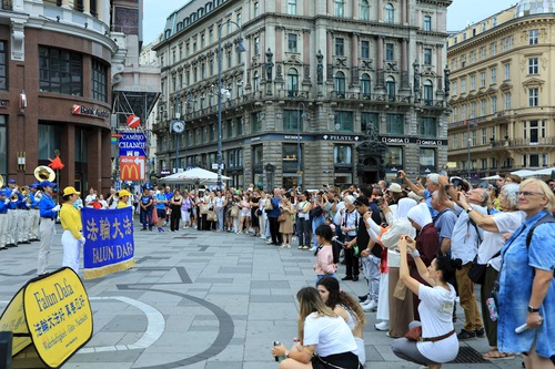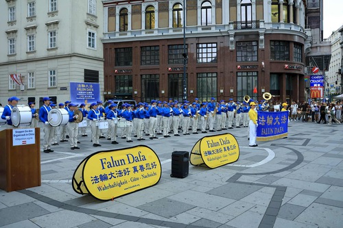 The Tian Guo Marching Band performed at Helmut-Zilk-Platz near the Vienna State Opera on August 30, 2025. Practitioners displayed posters, handed out flyers, and collected signatures on the petition.